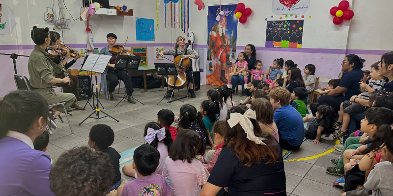 Durante el 25 y 26 de noviembre, 240 niños y niñas de primera infancia pertenecientes a Jardín Peumayen, Jardín Doña Letizia, Escuela Pedro Aguirre Cerda, Jardín Allipen, Jardín Ayin Antun de Conchalí, tuvieron la oportunidad de acceder a una experiencia cultural de música clásica, participando de manera didáctica para conocer los instrumentos asociados al cuarteto de cuerdas y cómo éstos operan en la práctica, a través de piezas musicales como “El Danubio azul” y los cuentacuentos musicalizados de “Cantaba la rana” y “¿Lobo estás?”.